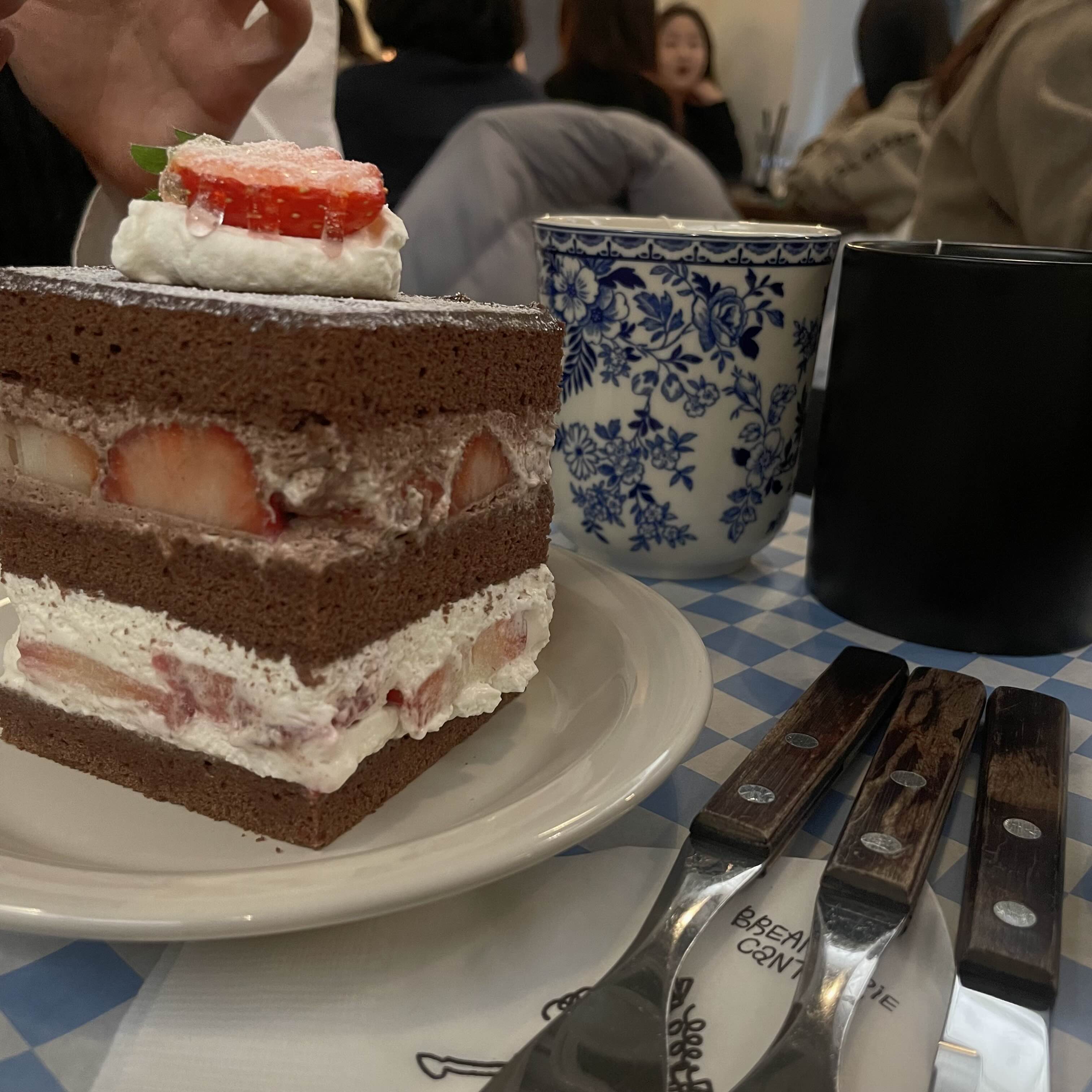 결국 저희는 딸기초코케이크(8,500원)을 시켰어요! 솔직히 인스타용 카페가 플레이팅만 엄청 신경쓰고 내용물 자체는 부실한 경우가 많은데 여기는 웬걸? 정말 딸기가 듬뿍 들어있더라구요! 딸기 자체가 신선하고 달고,생크림도 느끼한게 아니라 부드럽고 깔끔해서 '아 여기 재료는 아끼지 않는구나'라고 느꼈답니다! 초코도 싸구려 초코 맛 아니고 완전 고급친 초코케이크 시트였어요!